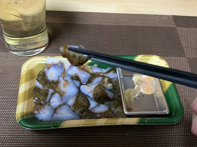 タコやイカのコリコリとはまた違う、ゴムのような弾力というか、顎で噛み切るのに結構な力が必要になります。