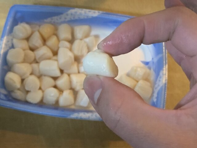 まず、サイズ。いたや貝はホタテよりも小ぶりで、貝柱も小さめ。いたや貝の貝柱は「小柱(こばしら)」とも呼ばれたりします。