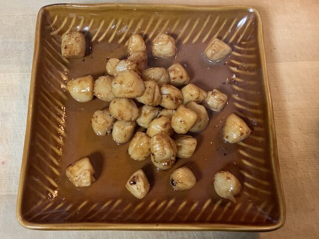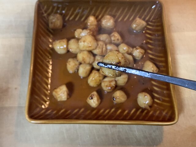 バター醤油のいい照りが出ていて、見た目はかなり美味しそう。小さな貝柱が皿の上にゴロゴロと並んでいる光景は、居酒屋のお通しっぽくもあります。